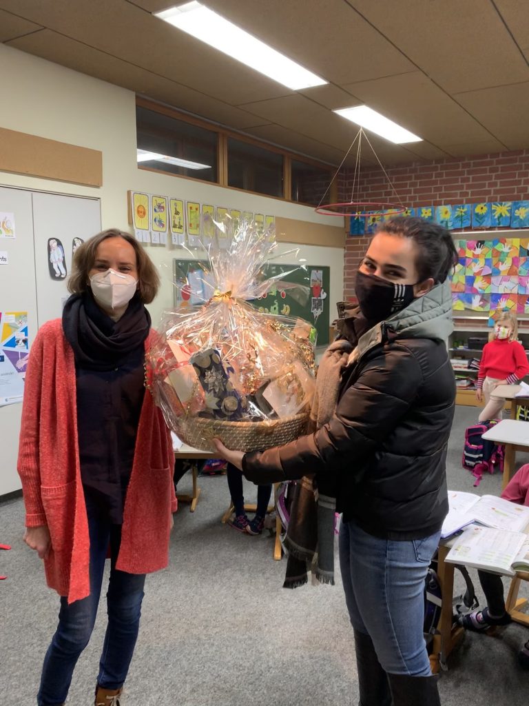Chalos (2. Elternklassensprecherin) und ich (1. Elternklassensprecher) haben dann am Montag, 14.12. vor der Schule alle Geschenke eingesammelt. Chalos hat alles ganz lieb in einem Korb arrangiert und am nächsten Tag haben wir dann Frau Kästner-Kordowske den Korb überreicht. Sie war sichtlich gerührt und auch etwas überrrascht von der Fülle der Geschenke.