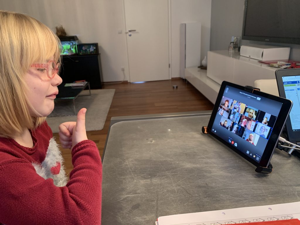 Um in Kontakt mir Frau Kästner-Kordowske und den MitschülerInnen zu bleiben gab es dann auch gleich zu Anfang die ersten Videokonferenzen. Für die Kleinen eine tolle neue Erfahrung, obwohl noch alle recht schüchtern vor dem Bildschirm sitzen 🙂